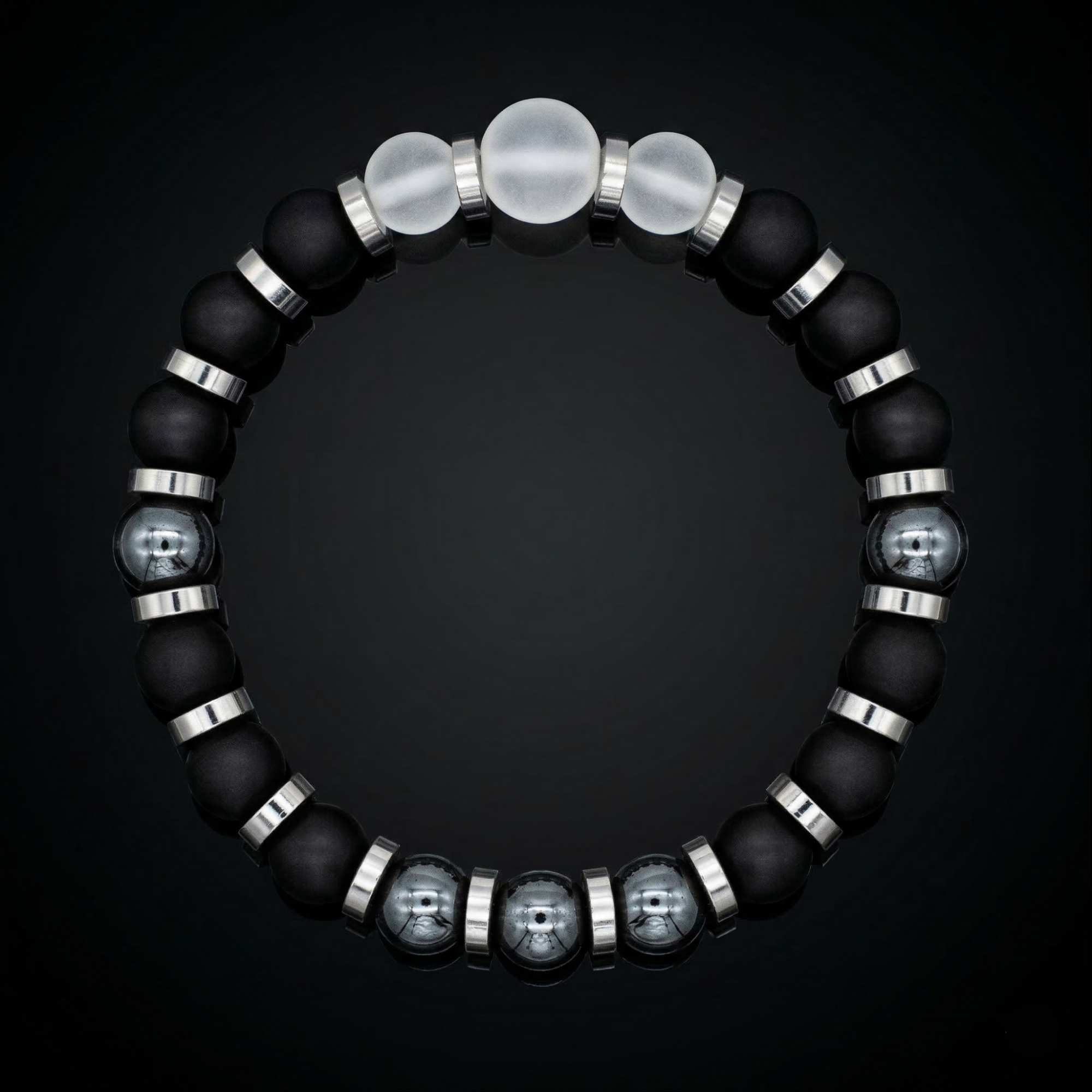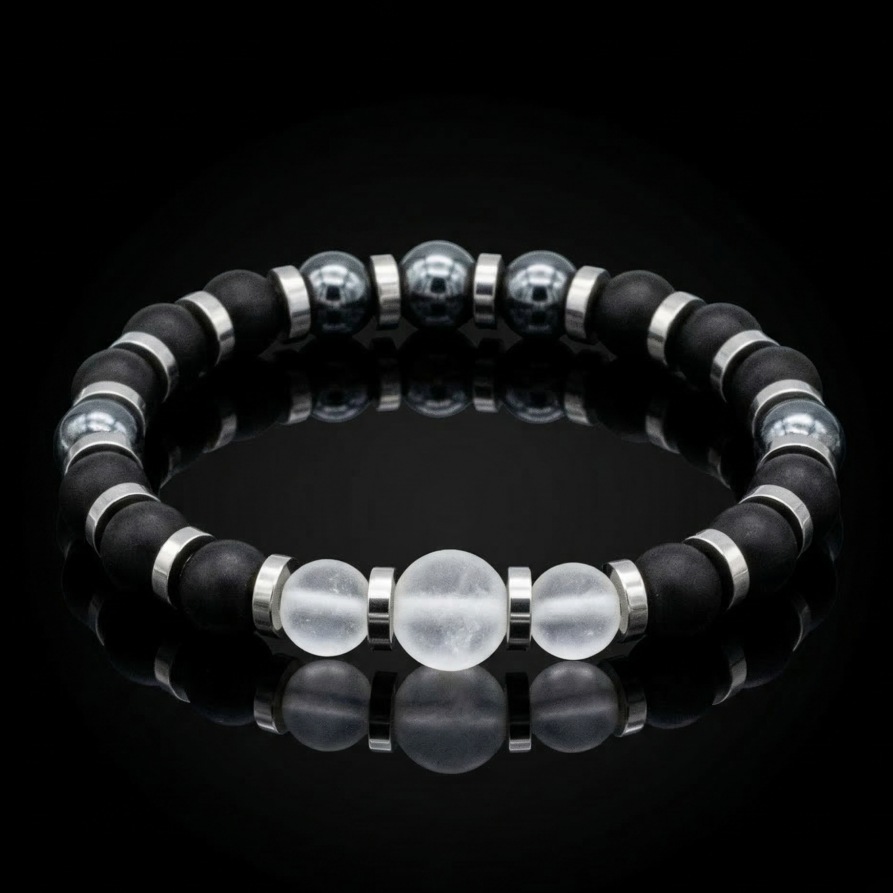 Discover the perfect balance of determination and focus with our meticulously handcrafted men's bracelet featuring Onyx Matte, Clear Quartz Matte, and Hematite. This elegant piece merges the energies of these natural stones to support your ambitions and shield you from negative influences.
