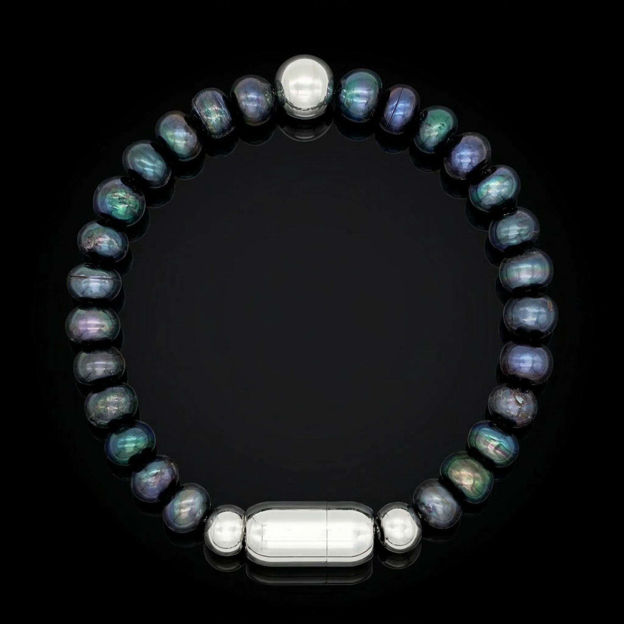 This bracelet features polished black pearls paired with a stainless steel magnetic clasp for ease and durability. Its deep iridescent tones complement tailored looks or elevate casual fits with a touch of quiet sophistication. Whether worn alone or with a timepiece, it reflects confidence rooted in calm.