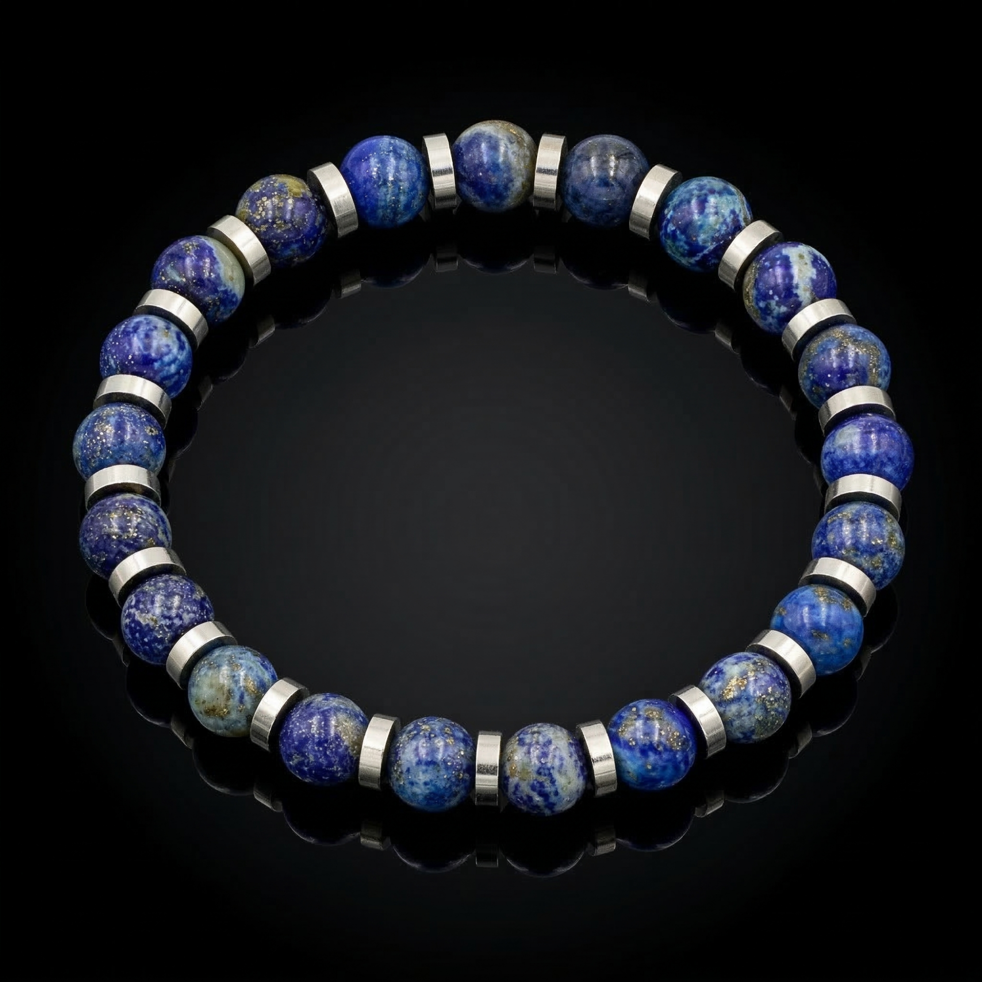Featuring 8mm blue lapis beads interspersed with modern steel spacers, the bracelet strikes a refined yet grounded balance. The design speaks to men who value structure, clarity, and discreet energy tools. It's equally at home in the boardroom or in daily rituals of self-mastery.