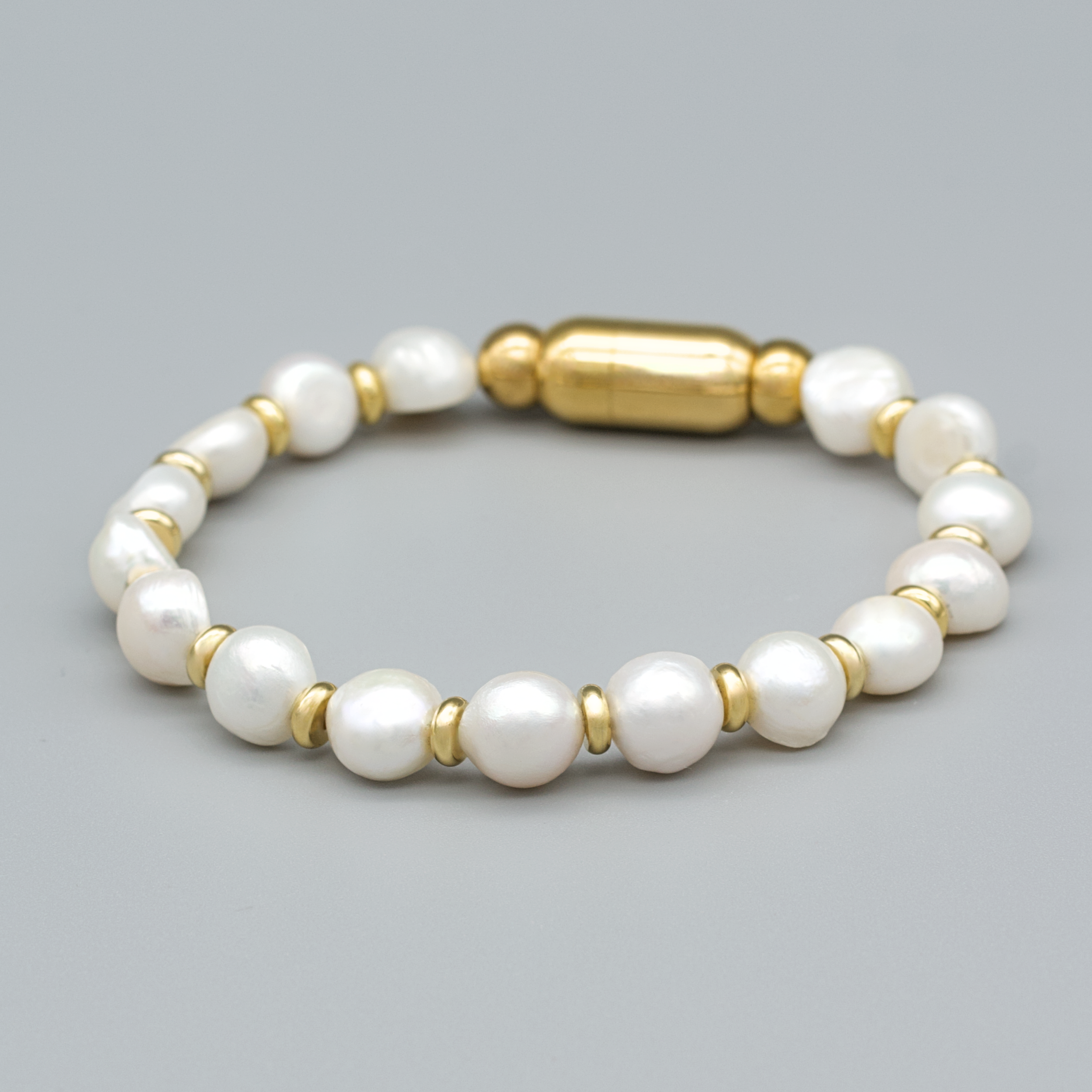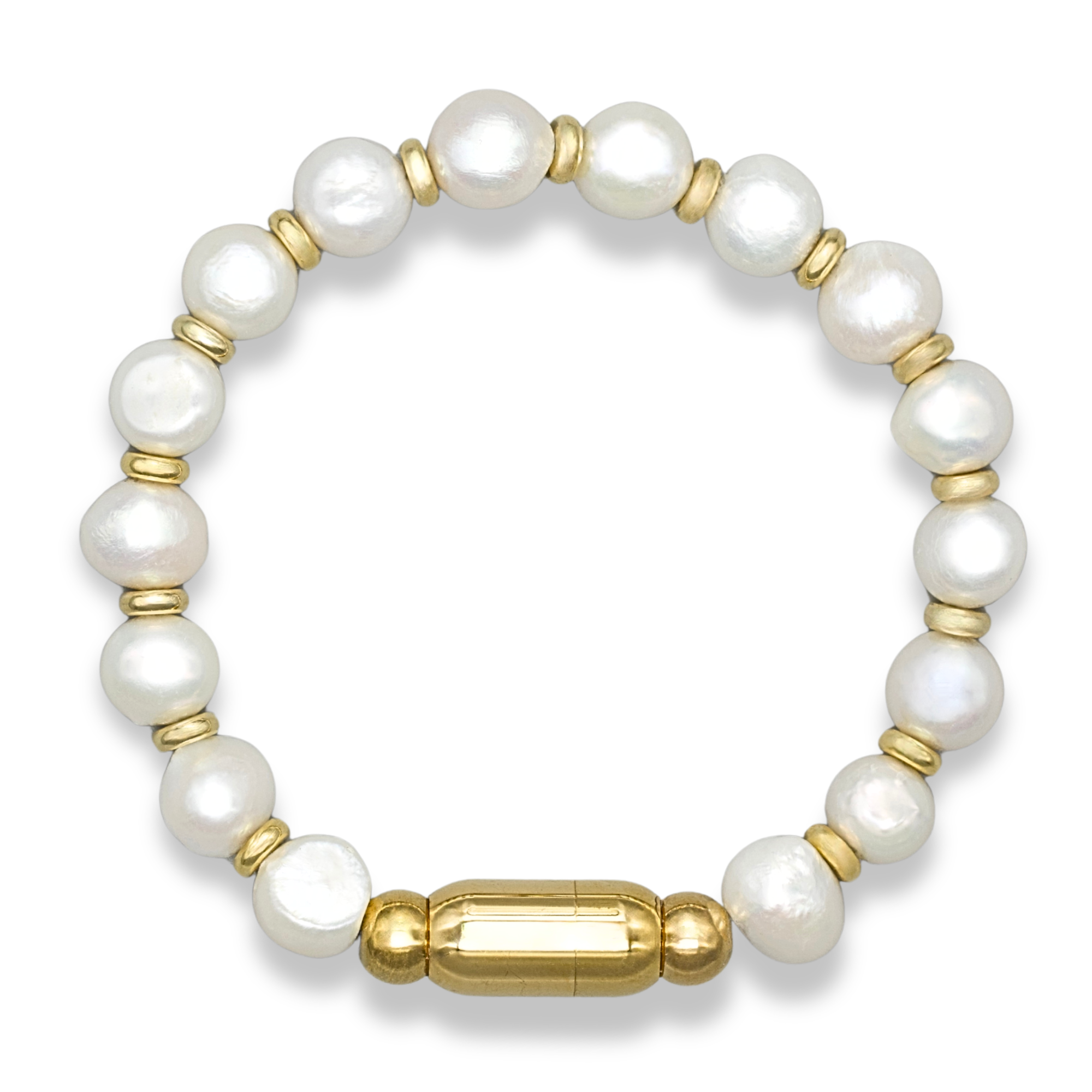 With a magnetic clasp for ease and security, this men’s bracelet pairs refined freshwater pearls with brushed stainless steel accents for a clean, modern aesthetic. It’s a quiet expression of emotional clarity—worn best by those who value intention over attention.