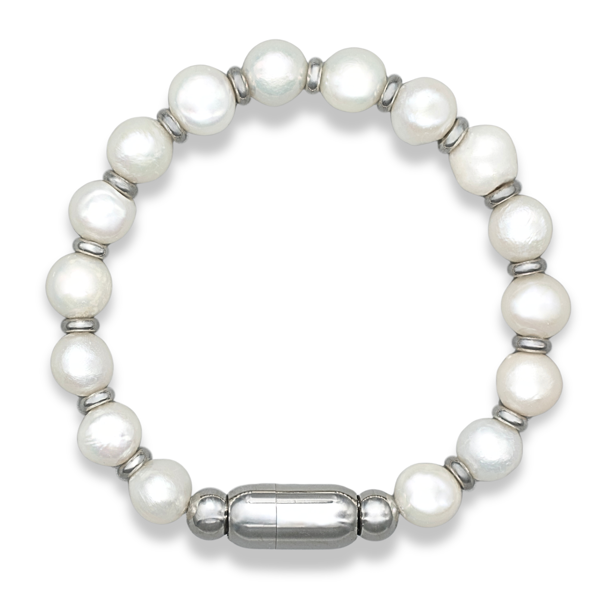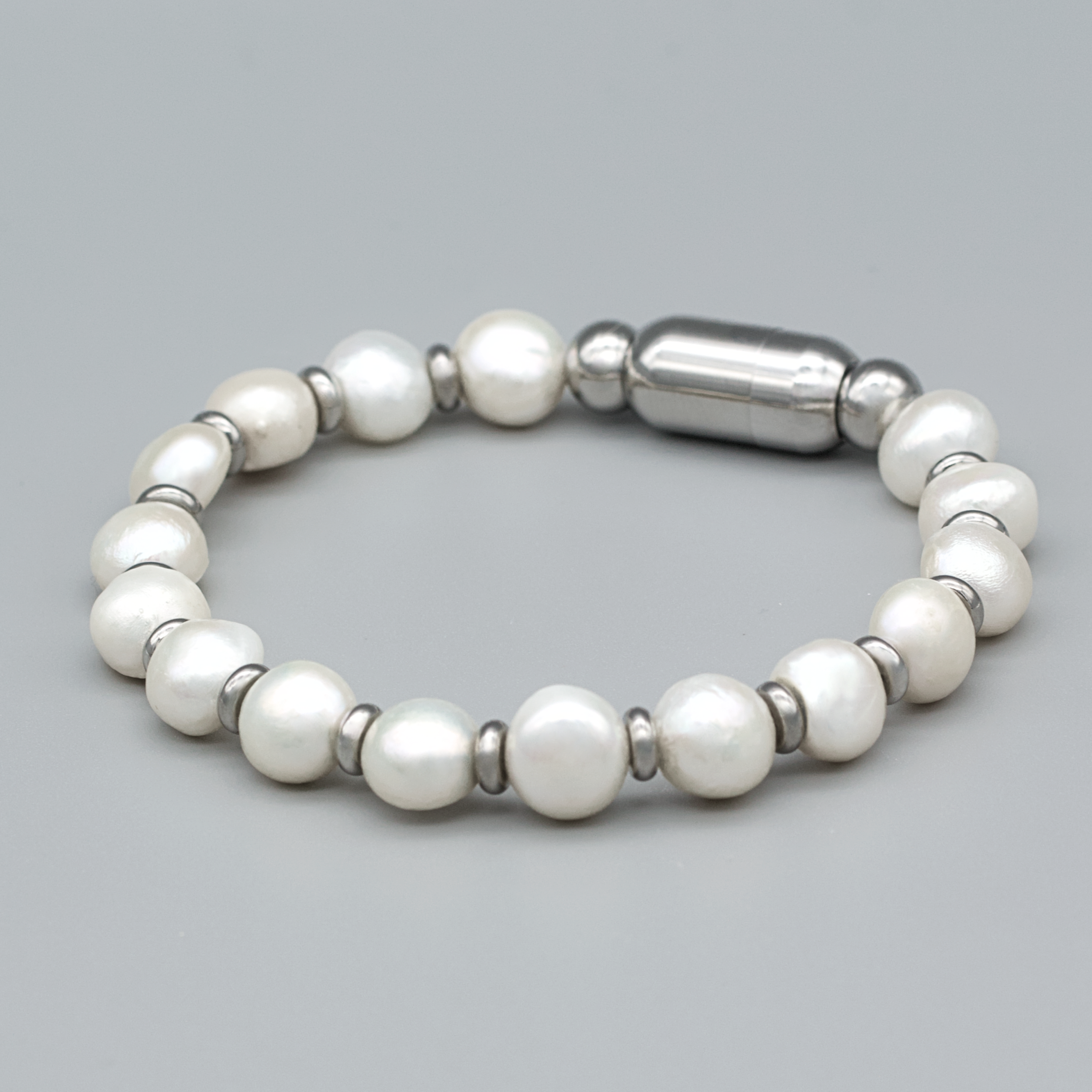Pearl is known for its unique ability to balance emotions and quiet mental noise. In this design, the natural luster of freshwater pearls works in synergy with steel tones to ground your energy and sharpen your intuition. This bracelet is ideal for professionals, thinkers, and creatives who lead with empathy and centered clarity.