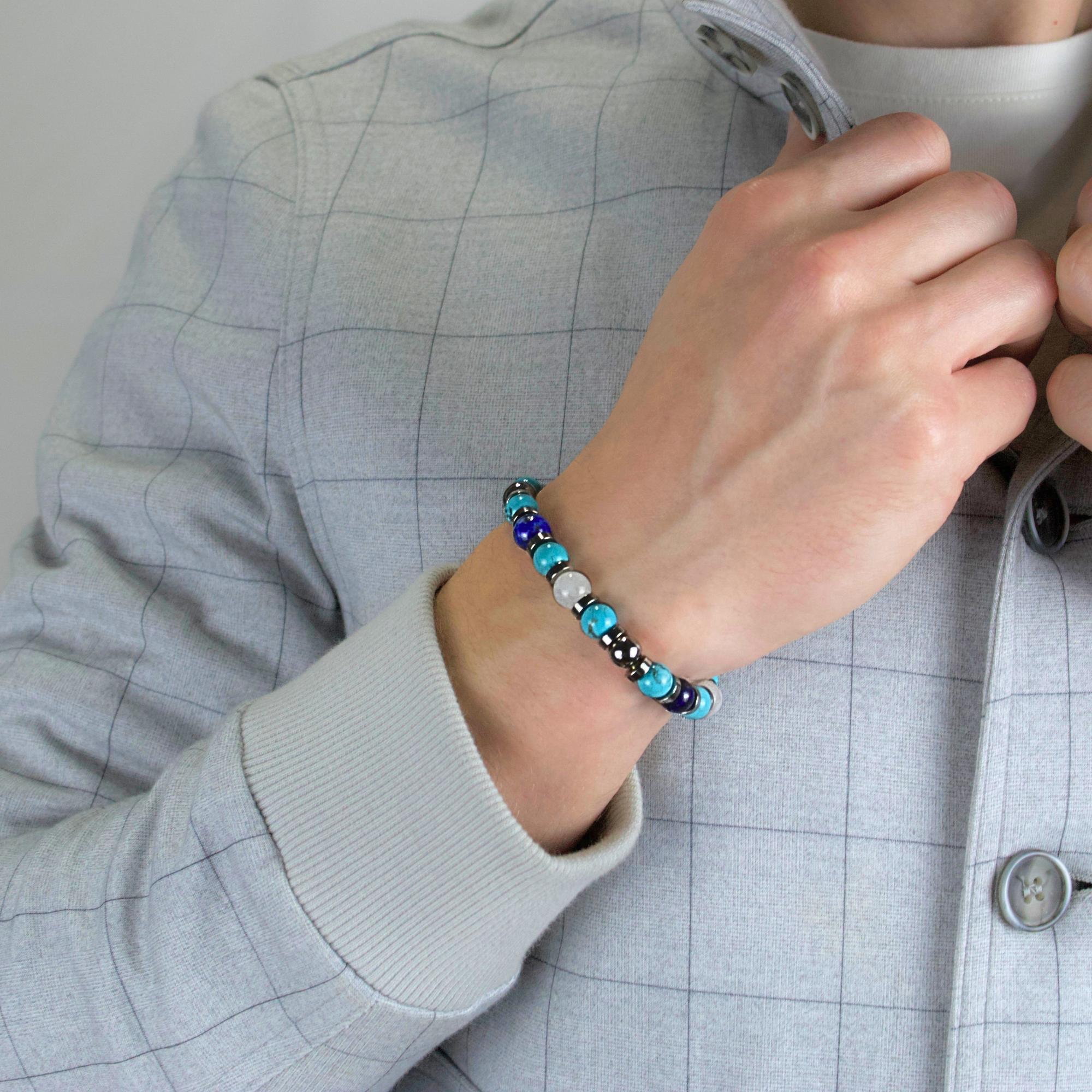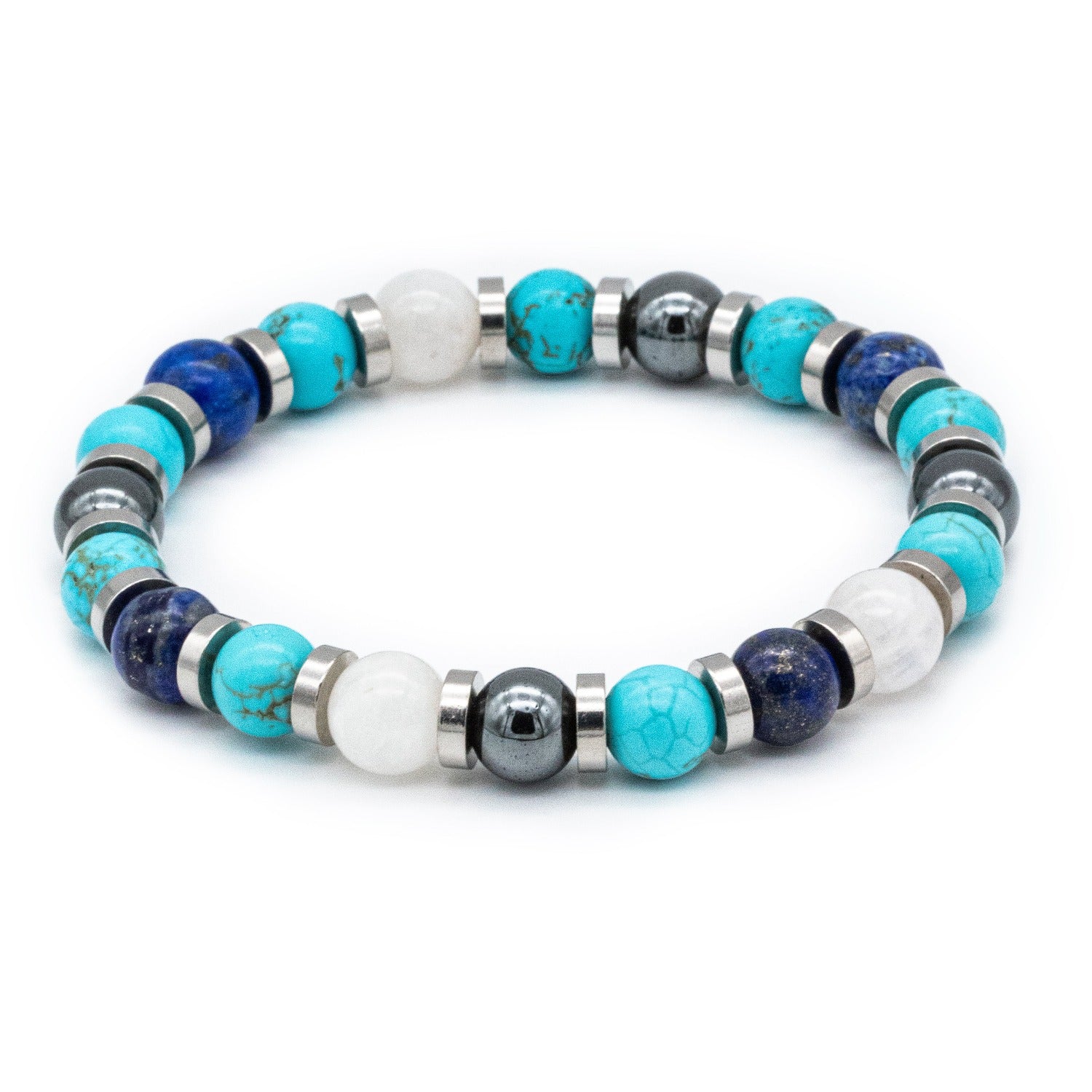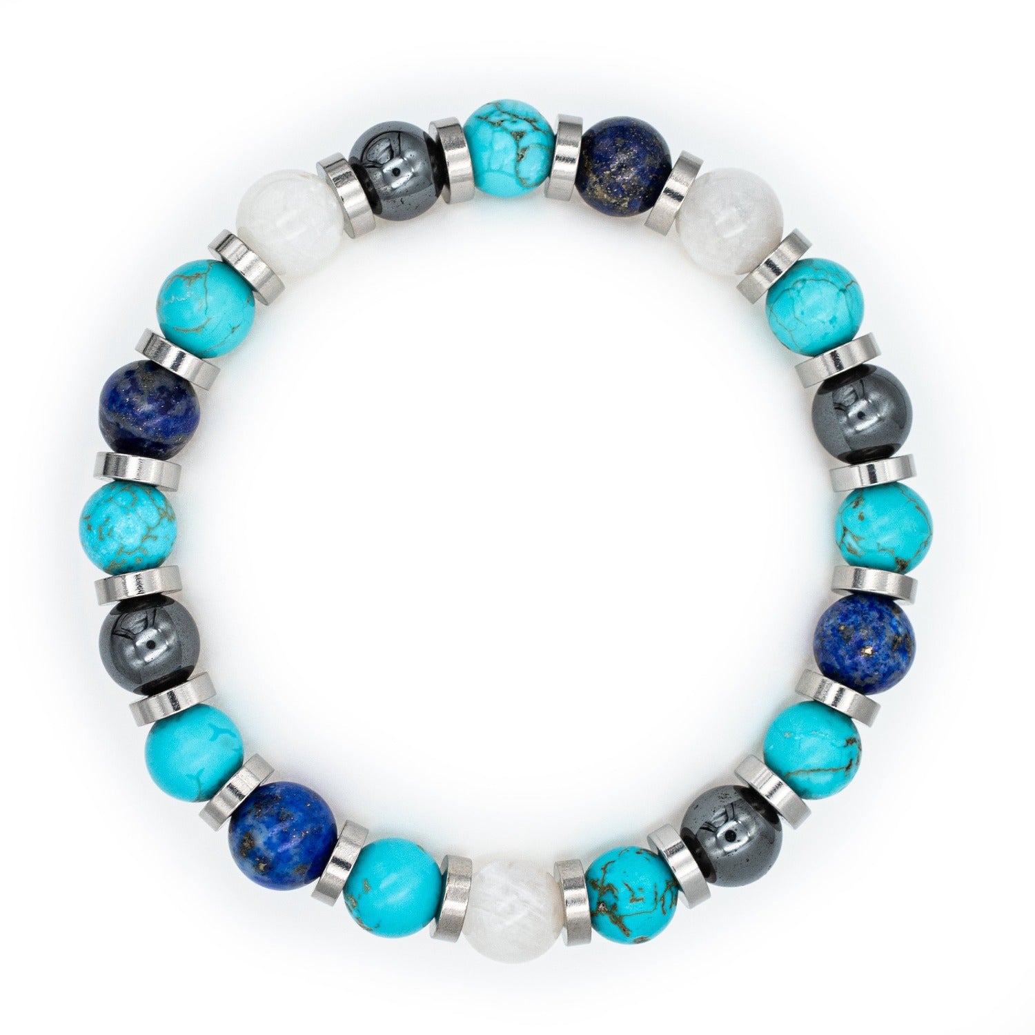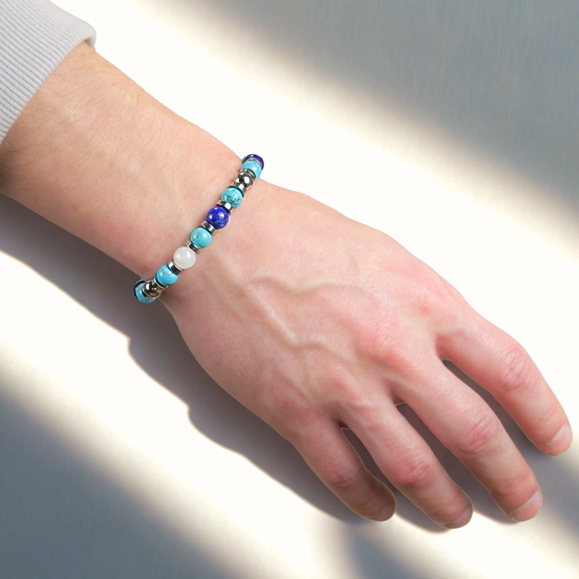 Unlock the power of synergy with this elegant beaded bracelet. Combining Lapis Lazuli, Belomorite (Moonstone), Hematite, and Turquoise, it enhances intuition, personal growth, and protection, creating a perfect balance of energies.