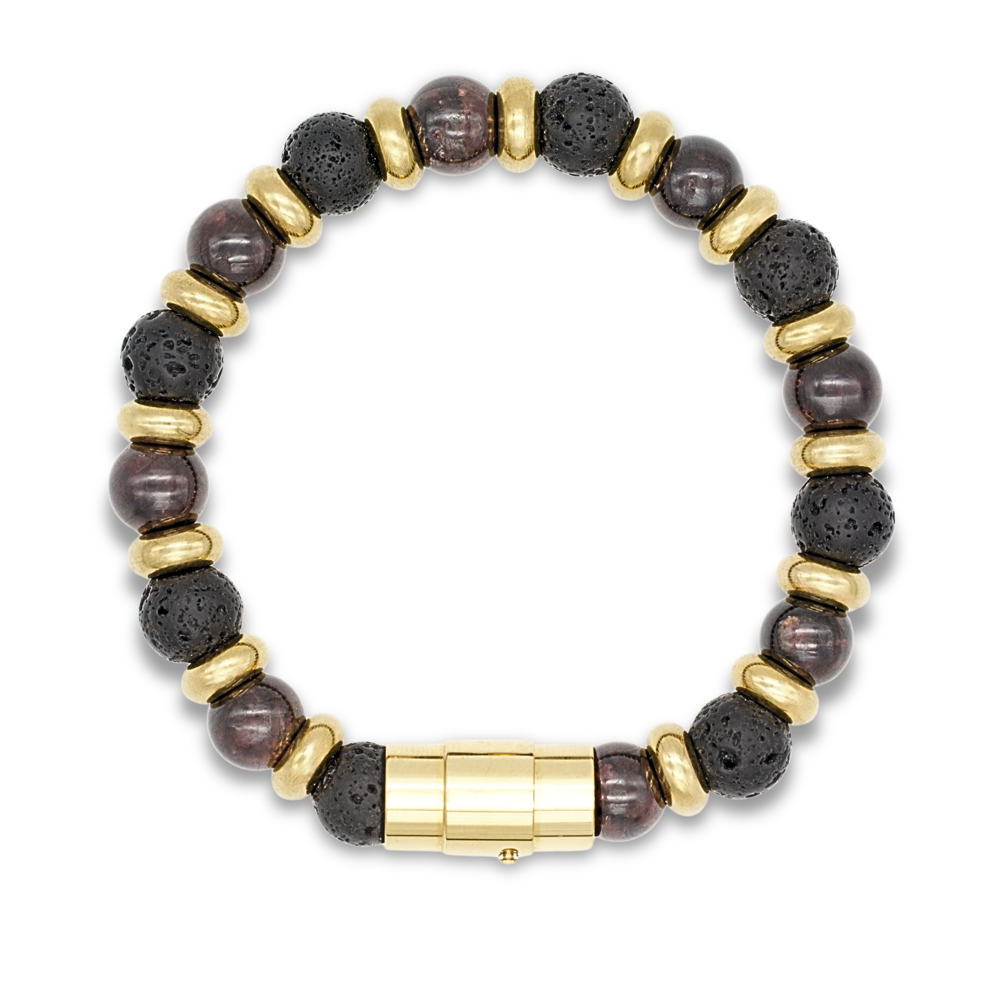 This bracelet unites two powerhouse stones: volcanic lava beads, born from the earth’s core to absorb stress and ignite inner renewal, and deep red almandine garnet, known for its grounding strength and emotional endurance. Together, they offer balance in intensity — calming reactive impulses while boosting assertiveness, resilience, and masculine clarity.