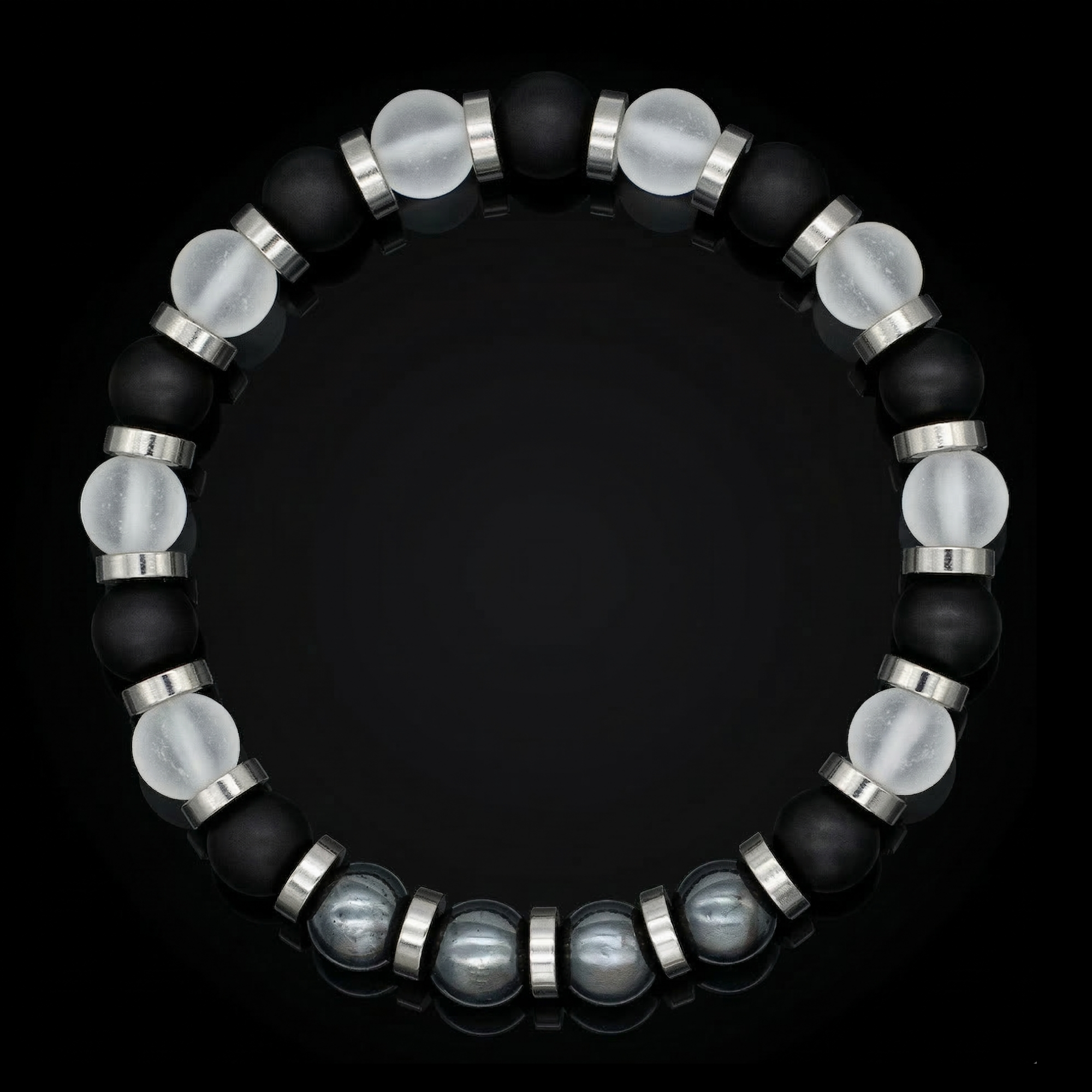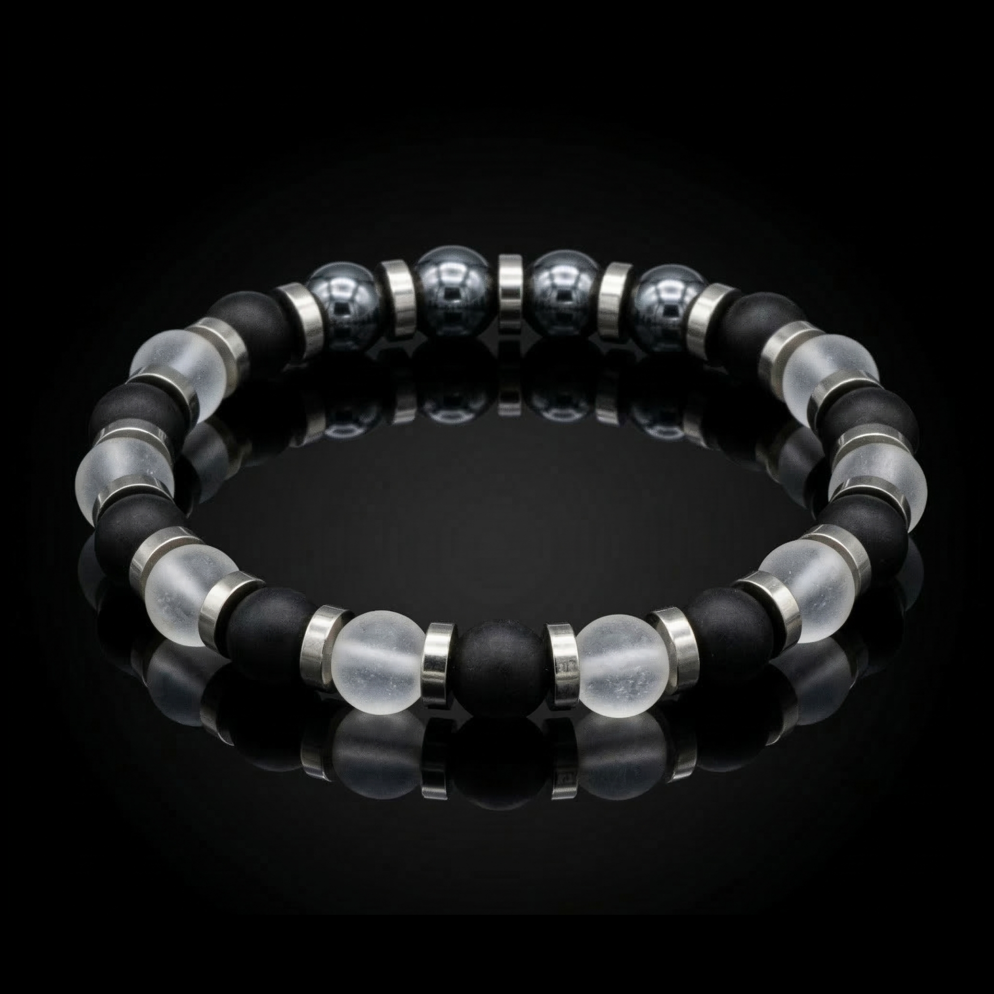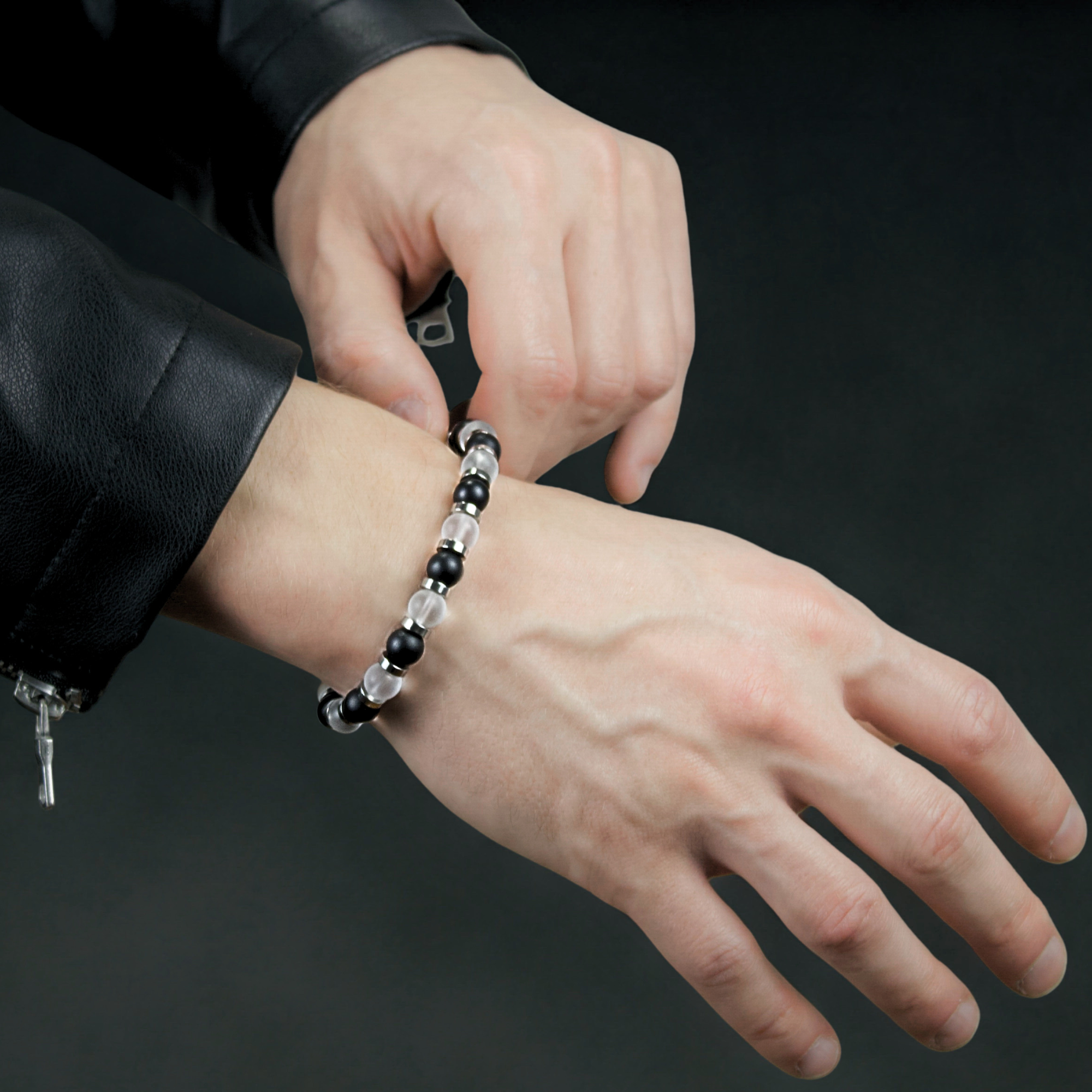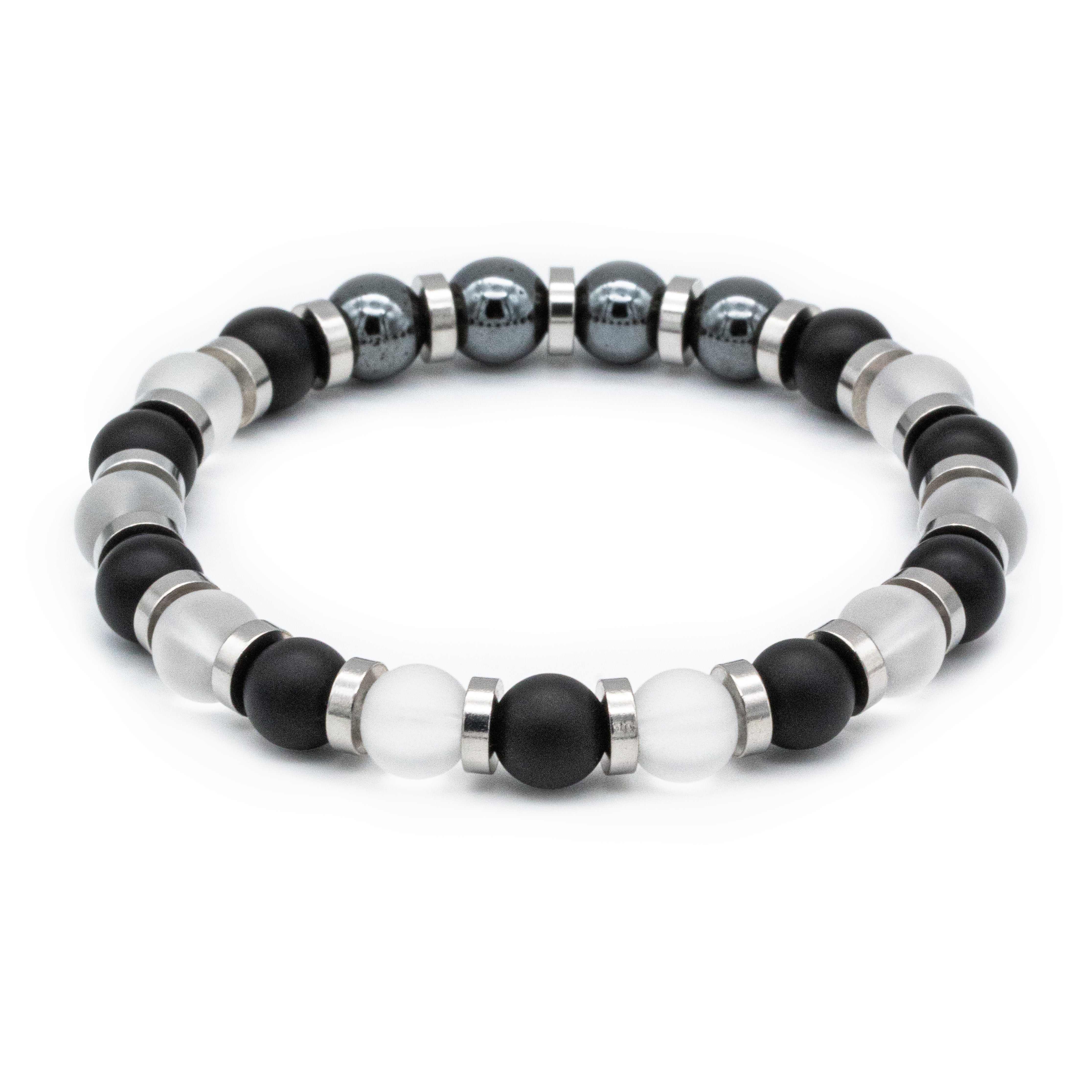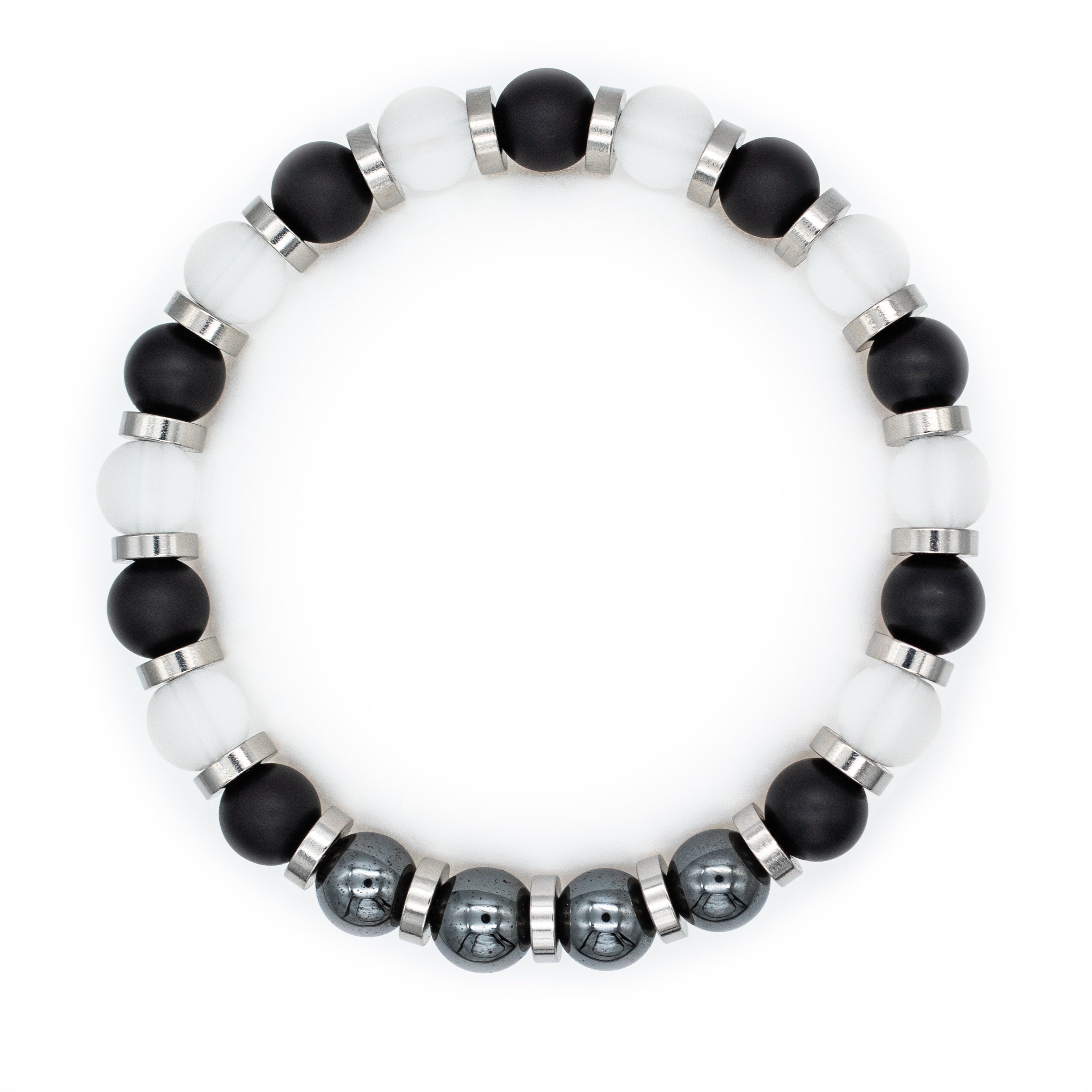 Embrace your inner strength and clarity with our refined men's bracelet featuring Onyx, Clear Quartz, and Hematite. This sophisticated accessory combines the energies of these powerful stones to enhance your personal resilience, focus, and protection.
