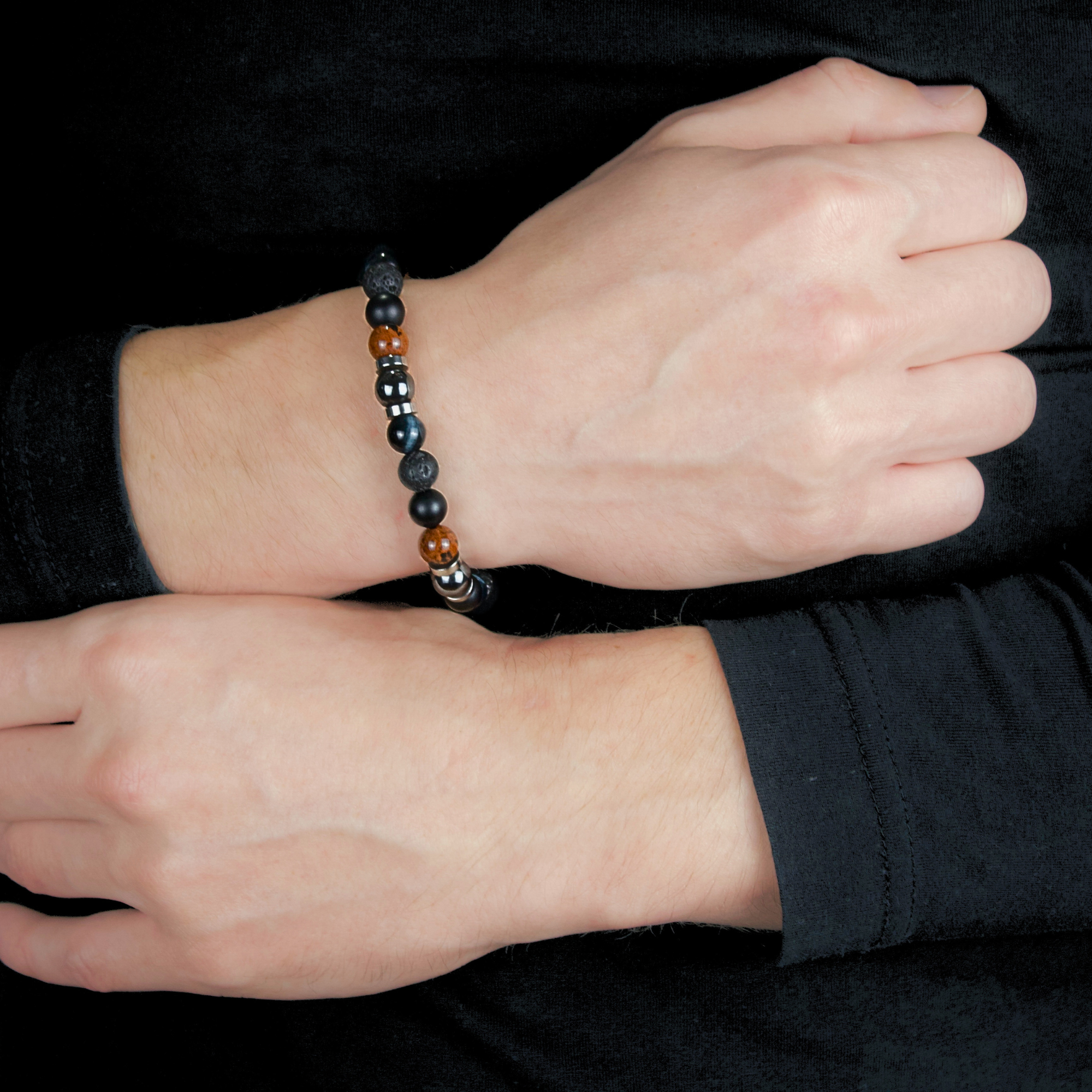Elevate your style with our meticulously handcrafted men’s bracelet, uniting the distinctive qualities of Onyx, Blue Tiger Eye (Hawkeye), Lava Stone, Mahogany Obsidian, and Hematite. Designed to represent confidence, ambition, and poise, this piece serves as a refined companion in both personal and professional settings.