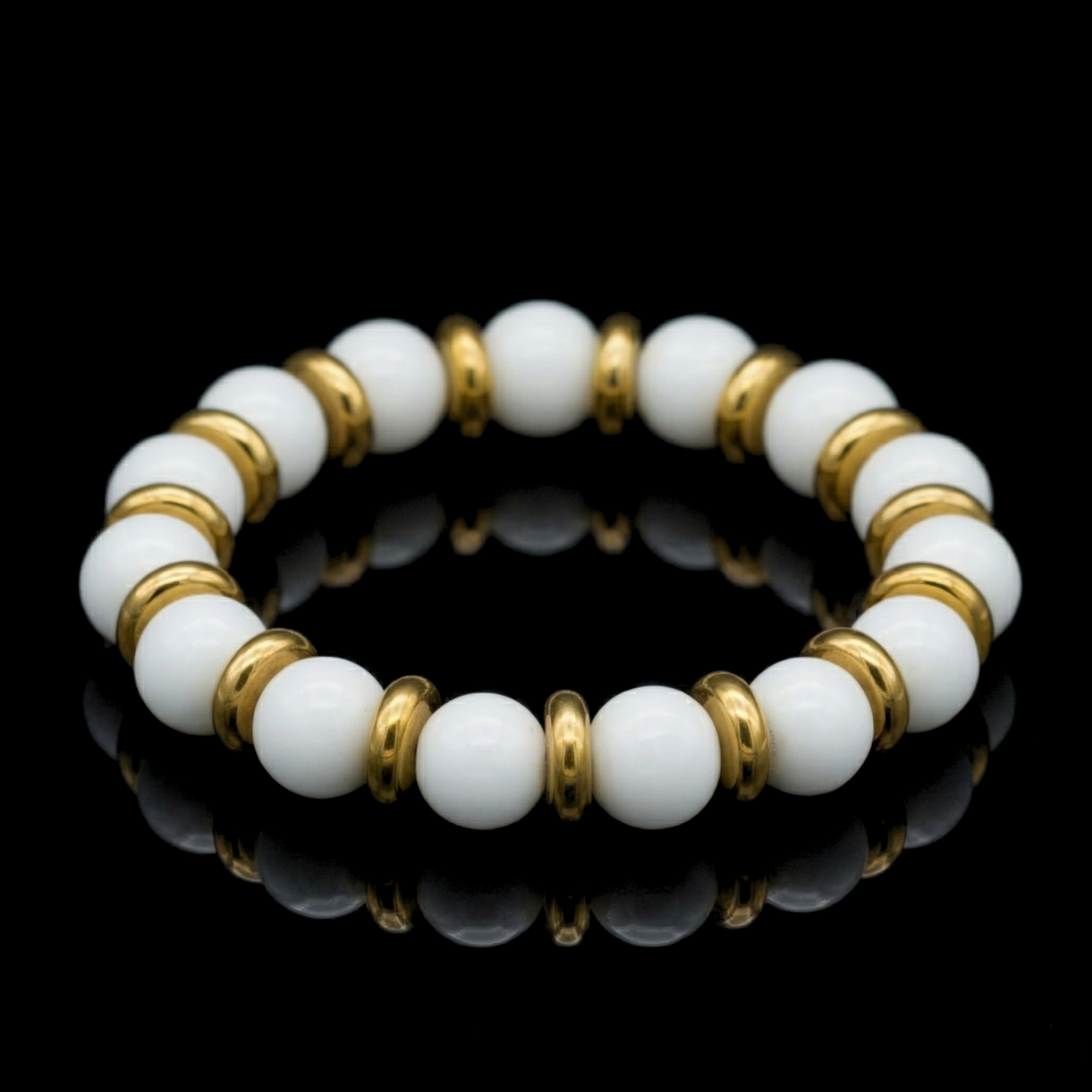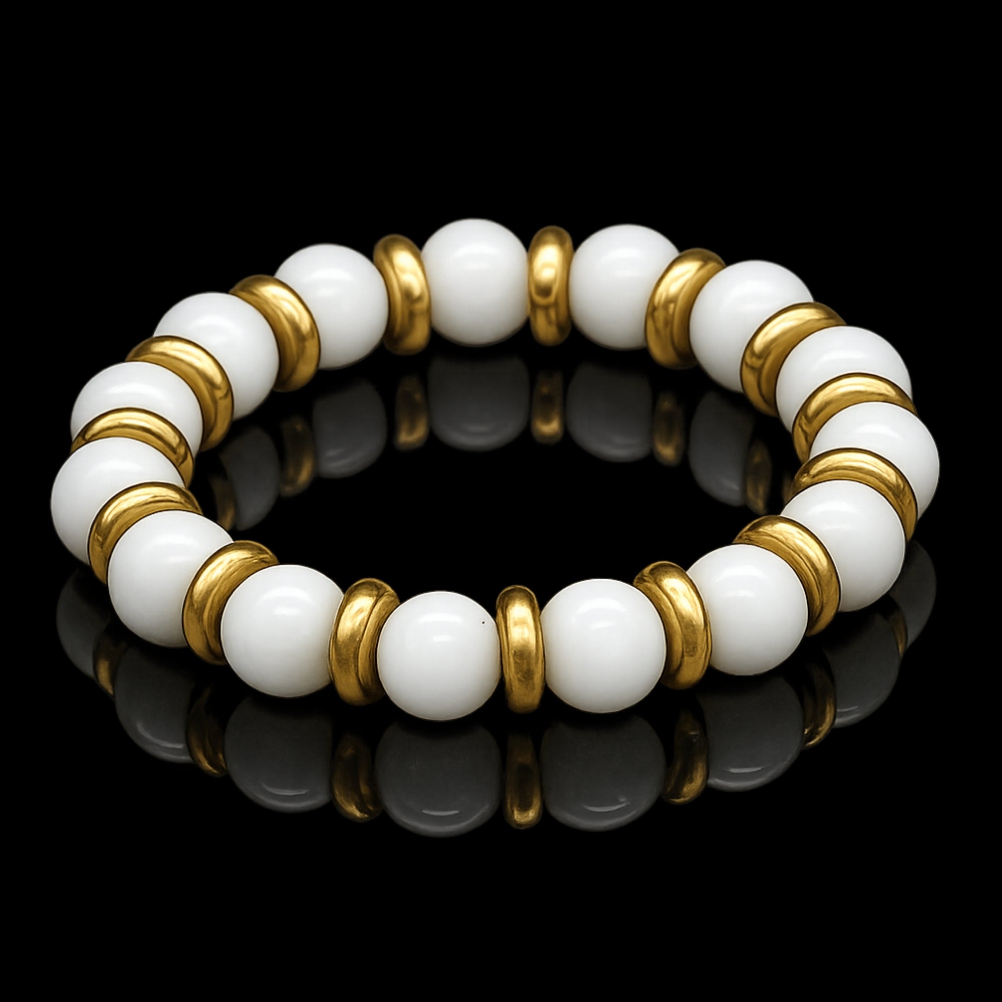 This elegant women's bracelet, handcrafted with natural white agate and gold-plated spacers, is more than just a minimalist accessory — it’s a wearable embodiment of peace, self-confidence, and quiet power. Designed for women who navigate the world with grace and clarity, this bracelet supports your inner calm and focused presence.