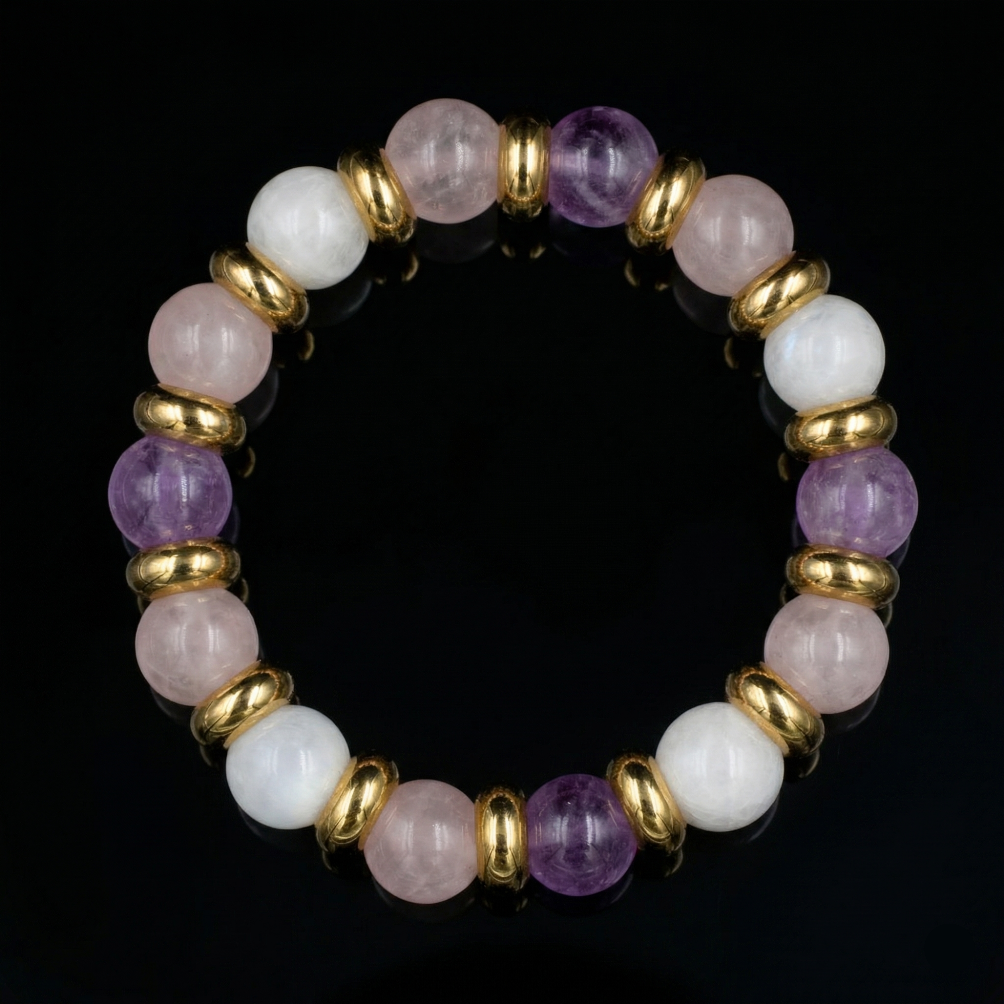 This handcrafted women's bracelet blends the heart-opening warmth of Rose Quartz, the spiritual clarity of Amethyst, and the intuitive calm of Moonstone. Together, they form a powerful trio to soften emotional tension, restore self-love, and anchor inner peace through every transition.