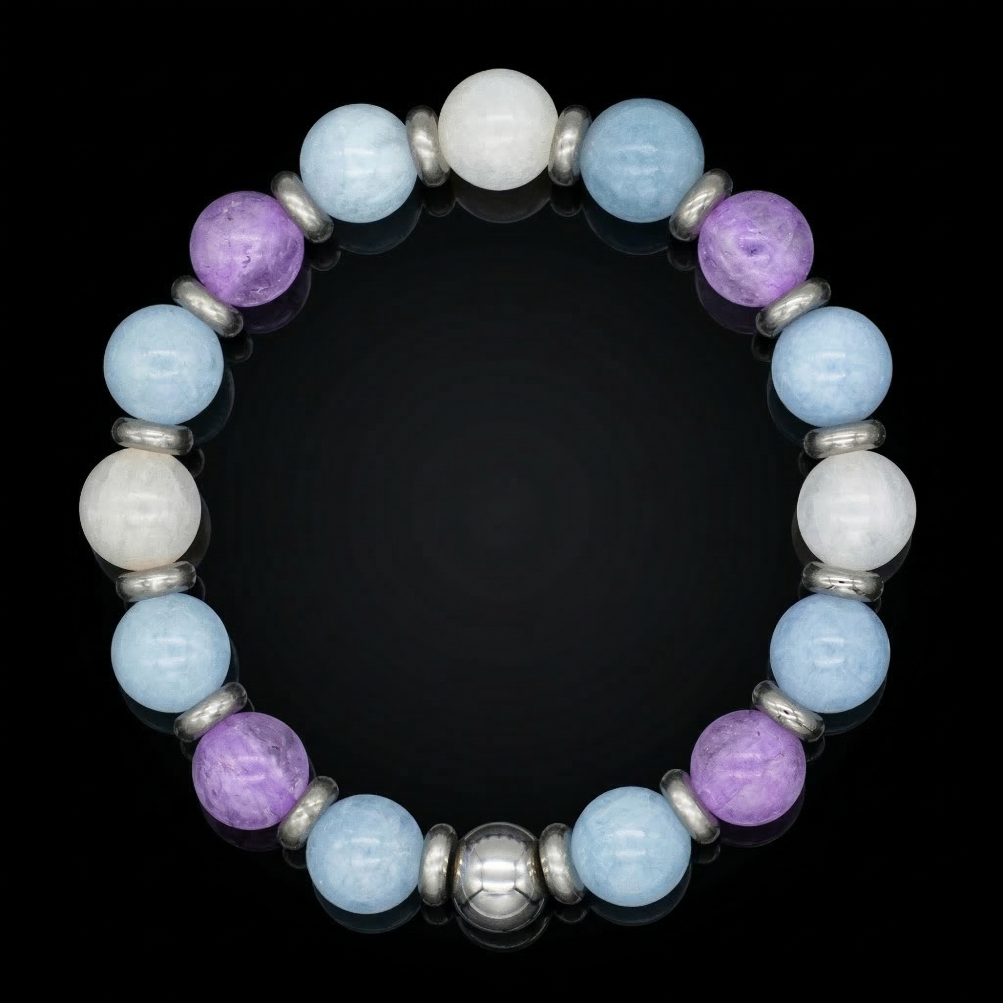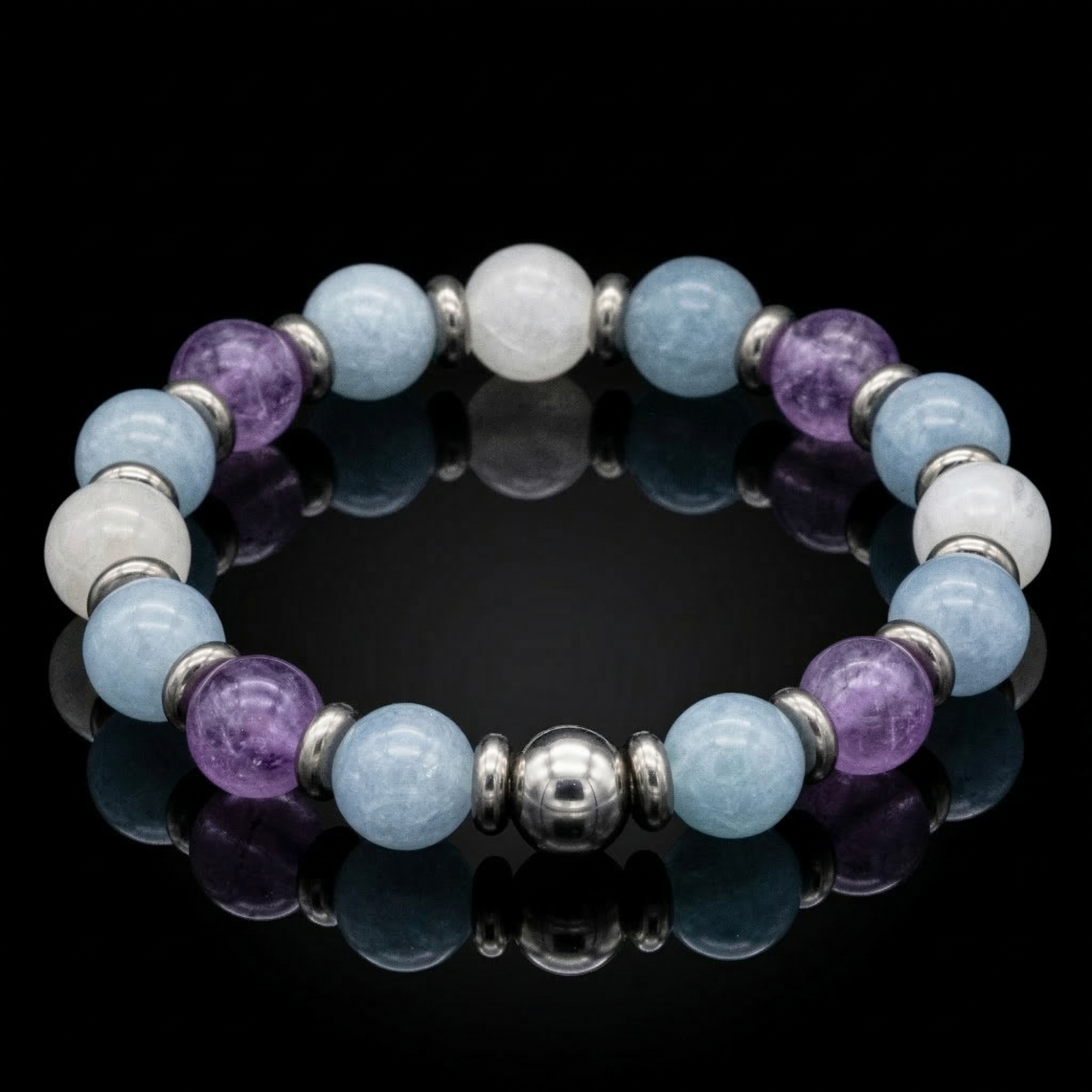 Elevate your sense of calm and wisdom with our beautifully crafted women's bracelet featuring Aquamarine, Amethyst, and Belomorite. This exquisite piece combines the soothing and clarifying energies of these three remarkable stones, creating a powerful synergy that enhances empathy, emotional balance, and personal growth.