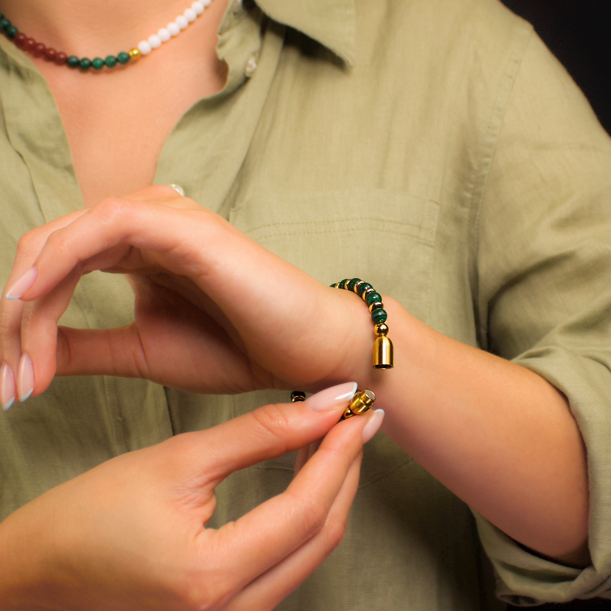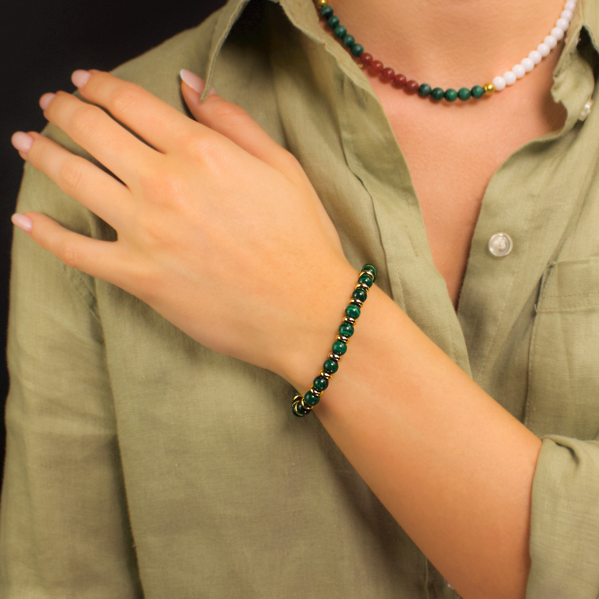 This handcrafted Malachite bracelet is designed for women who balance ambition with emotional wisdom. Revered for centuries as a stone of clarity and transformation, Malachite empowers you to pursue success, express your creativity, and trust your inner voice—all while staying grounded and protected.