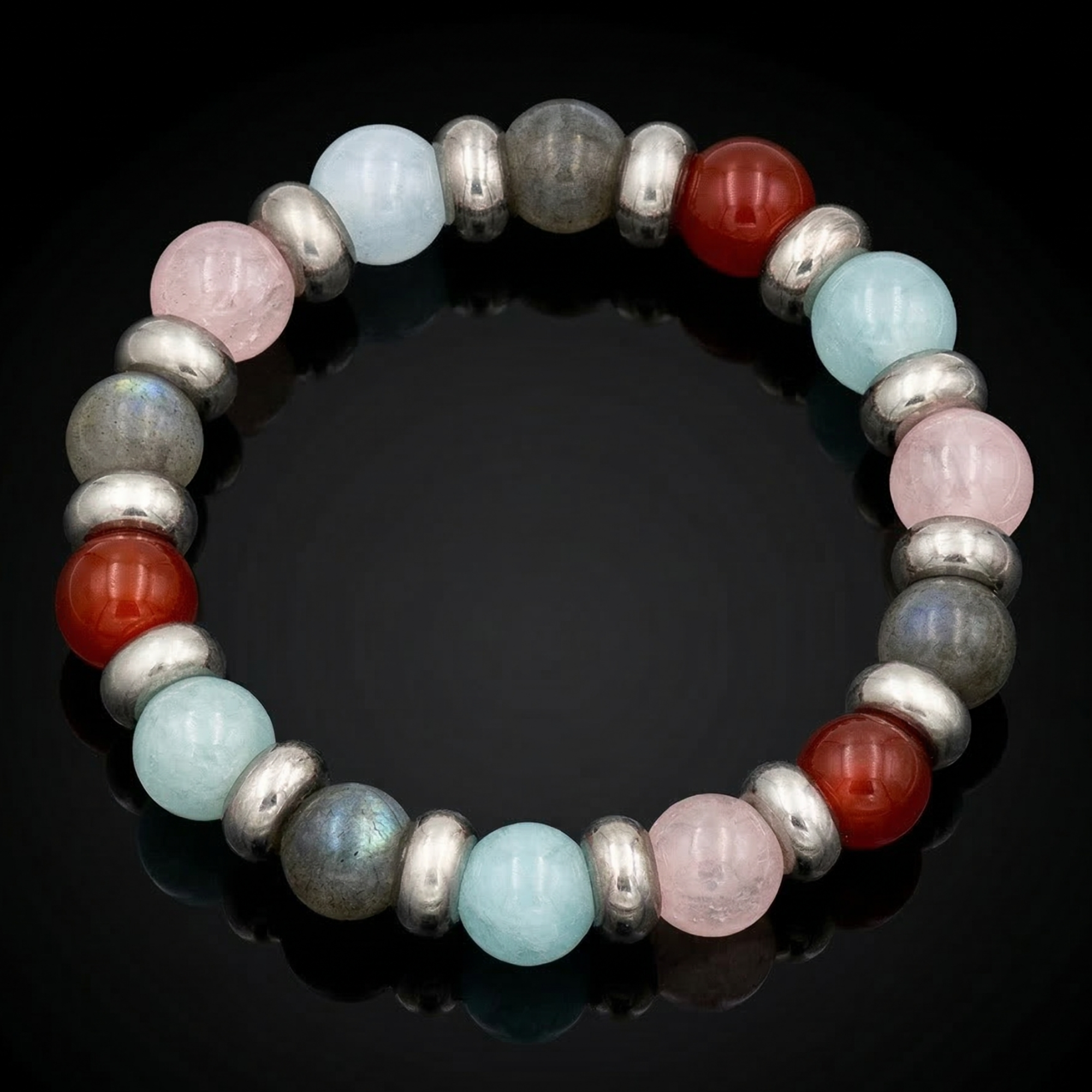 Our Natural Stone Bracelet is designed to enhance emotional well-being and strengthen family bonds. Crafted from high-quality Carnelian, Aquamarine, Quartz Rose, and Labradorite, this exceptional bracelet is the perfect accessory for those seeking harmony and balance in their personal relationships.