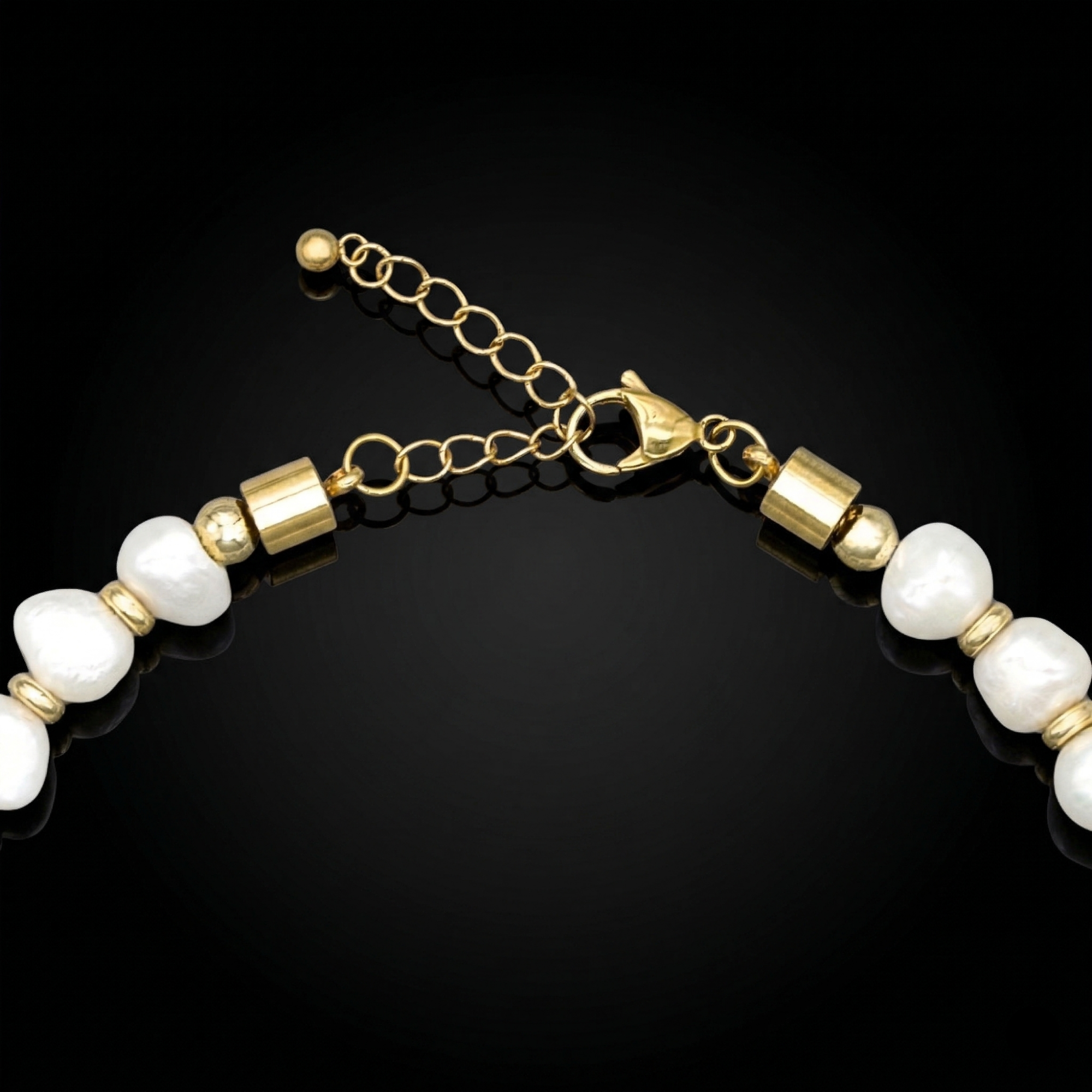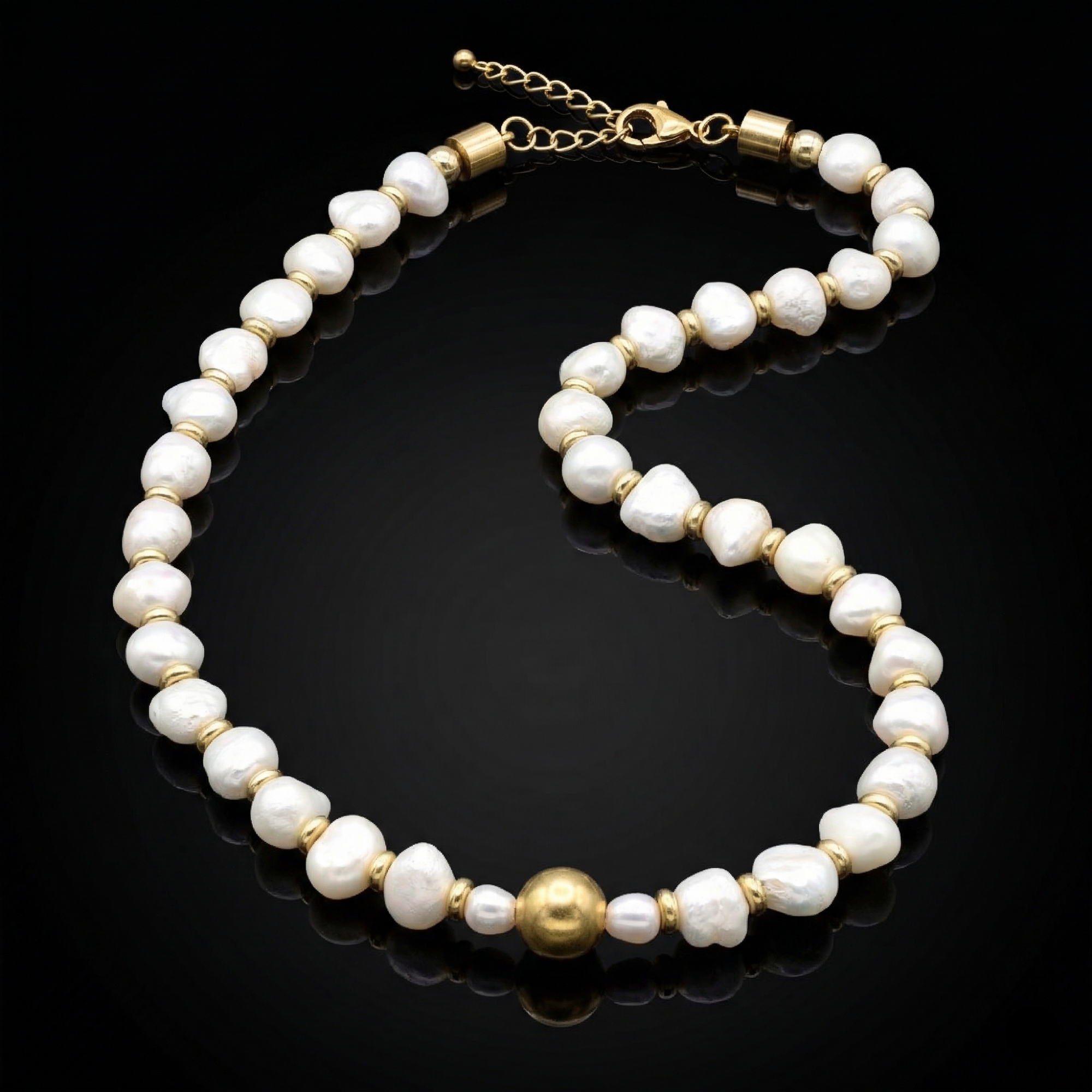 Designed with polished irregular pearls and gold-toned details, this necklace effortlessly combines elegance with subtle power. Whether layered or worn solo, it brings softness and stability to any look. The adjustable clasp allows perfect fit for both everyday styling and graceful occasions.