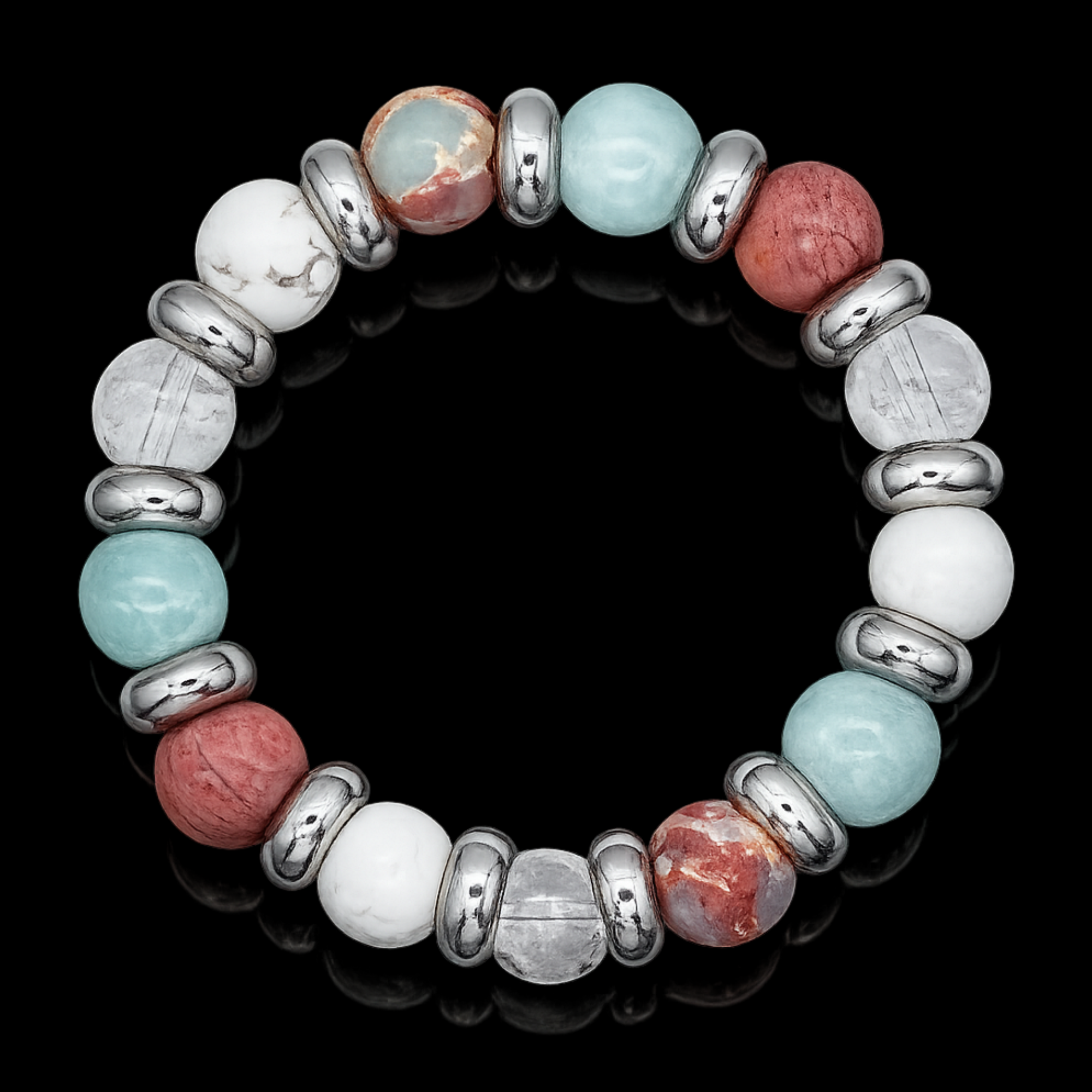 Embark on a path of personal growth and emotional balance with our unique women's bracelet. This piece features a harmonious blend of Aquamarine, Snakeskin Jasper, Clear Quartz, Rhodochrosite, and Howlite, each selected for their complementary attributes.