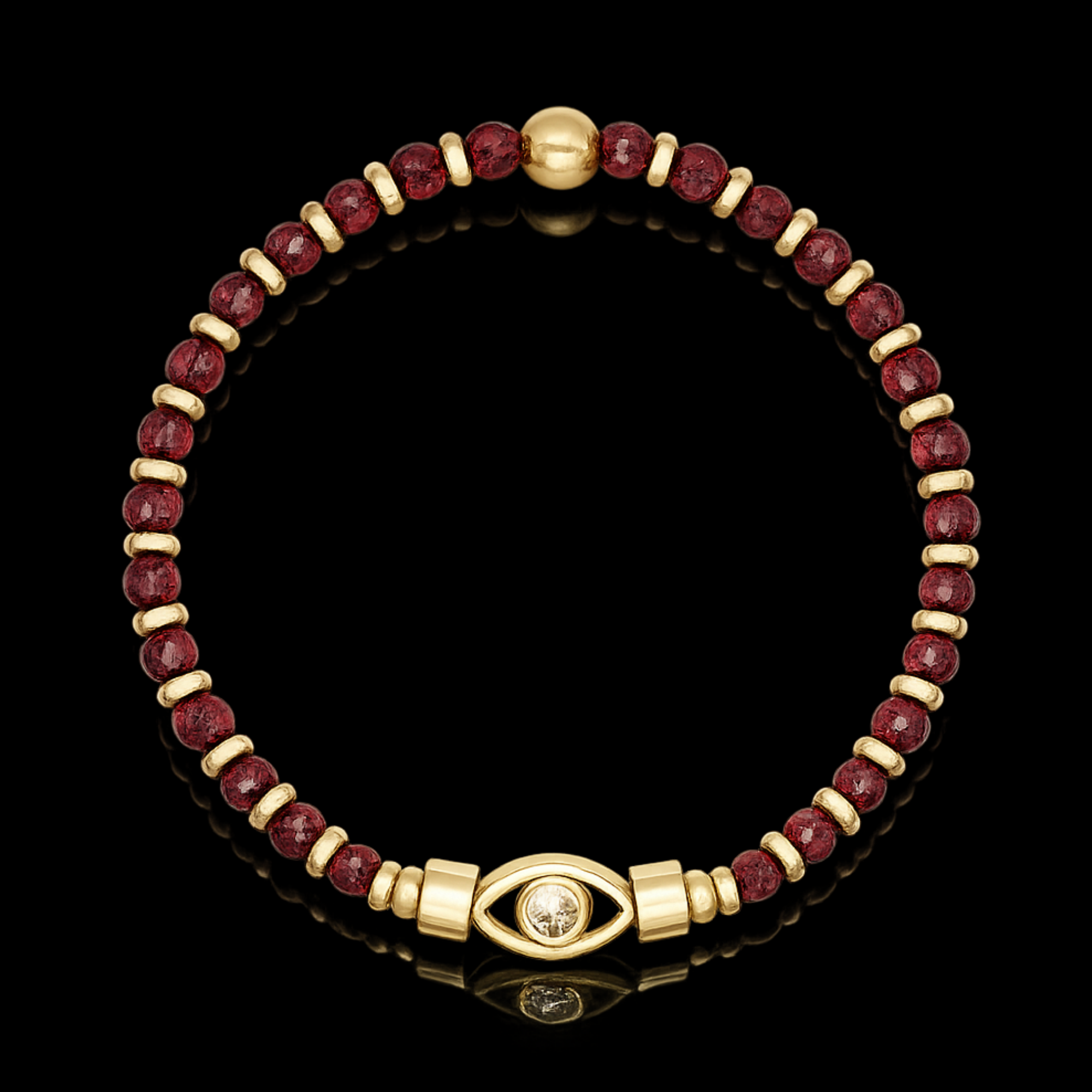This bracelet combines polished Garnet Pyrope beads with gold-plated stainless steel accents and a centered evil eye charm featuring a CZ crystal. Its timeless palette of rich red and gold makes it perfect for professional outfits or bold evening looks. Whether worn alone or stacked, it brings a grounded yet radiant energy to your daily style.