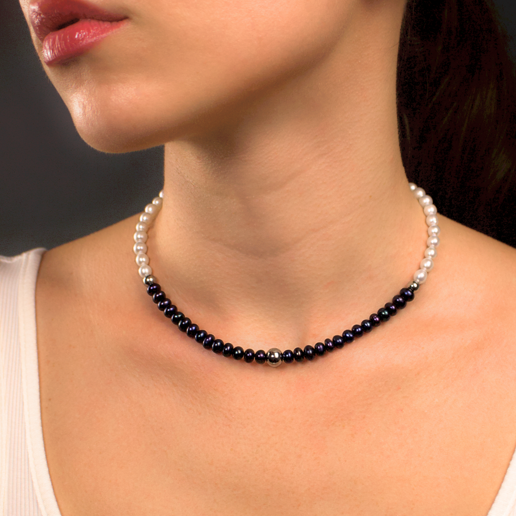 This striking choker unites luminous white pearls with mysterious black pearls in a design that embodies feminine elegance and quiet strength. A central stainless steel bead anchors the contrast, creating harmony between light and depth — perfect for women who lead with calm confidence and inner wisdom.